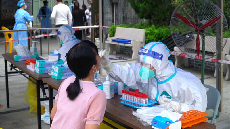 沙井街道辛养社区核酸采样点,防疫志愿者们忙碌着。
