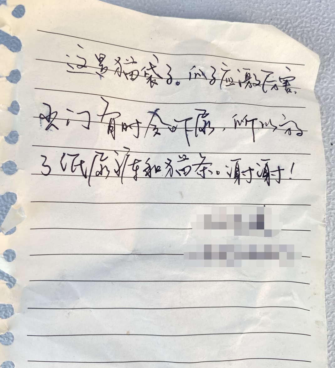 其中一位社区居民,在装着宠物猫的袋子旁留下一张纸条,上面写着:“这是猫袋子,“瓜子”应激厉害,出门有时会吓尿,所以放了纸尿裤和猫条,谢谢。”