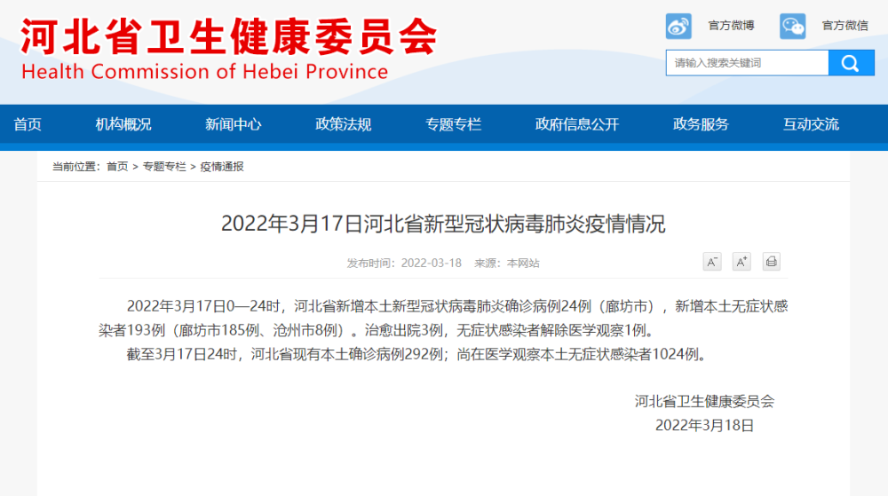 2022年3月17日0—24时,河北省新增本土新型冠状病毒肺炎确诊病例24例(廊坊市),新增本土无症状感染者193例(廊坊市185例、沧州市8例)。治愈出院3例,无症状感染者解除医学观察1例。