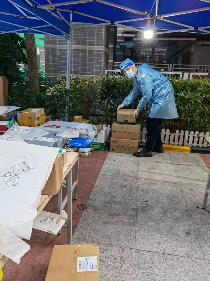 李鹏翔化身“快递小哥”在福田区天然居小区给居民派发快递。
