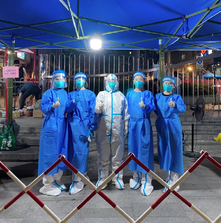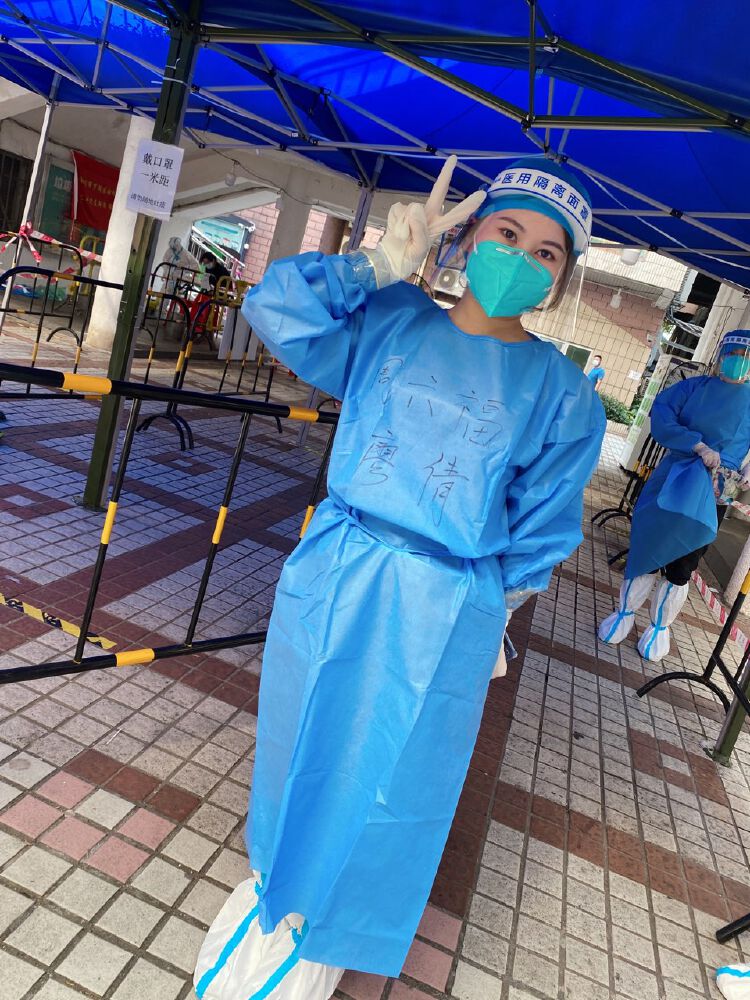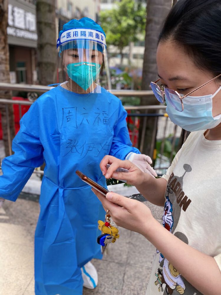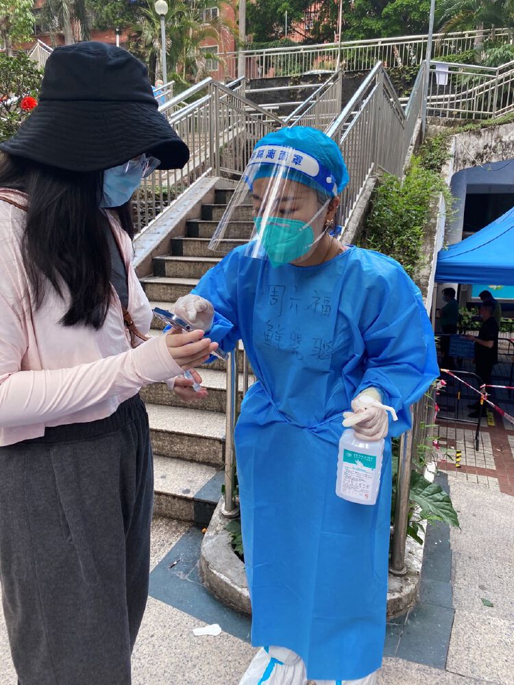 近日深圳气温逐渐上升,在松泉山庄某核酸检测点进行志愿服务的廖倩对记者说:“穿上防护服后,还要贴上胶布来防止皮肤暴露在空气中,这样衣服很快就会被汗水浸湿,口罩也有点勒。”但有一个瞬间让她感觉到十分满足,“有些居民看到我背后写着‘周六福’,知道我们是爱心企业员工,也是这个片区生活工作的普通市民,所以会特别跟我们表达感谢。”
