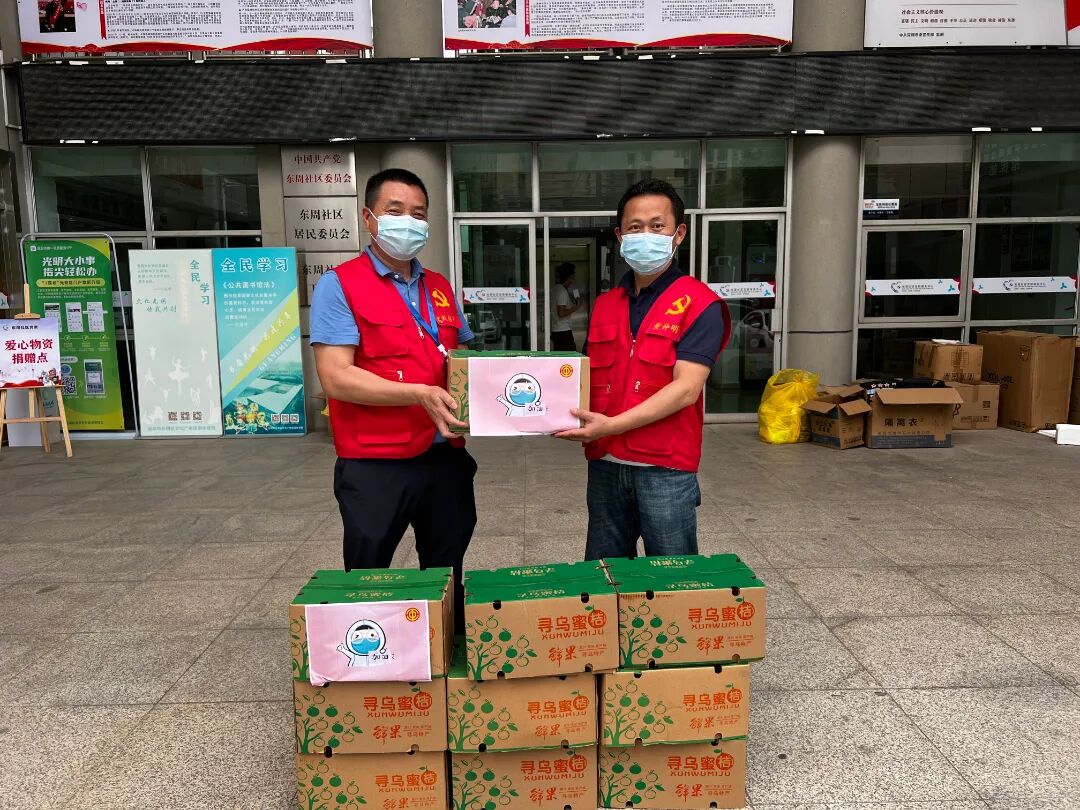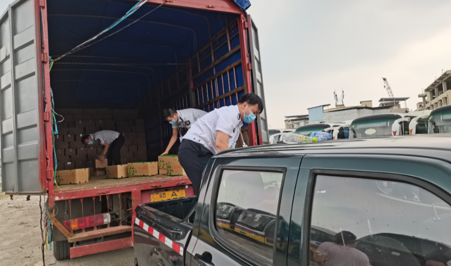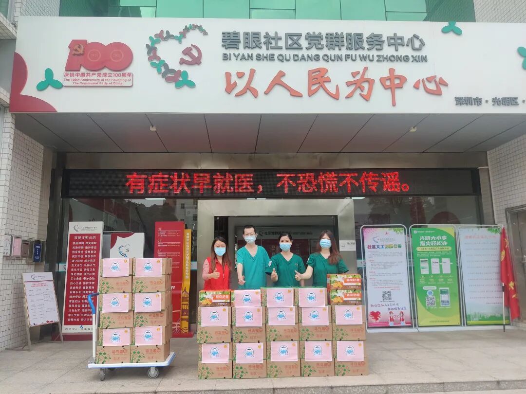 上午11点,其中一辆货车到达深圳市光明区光明街道暖蜂驿站,光明区总工会迅速将3万斤“甜心柑”、“暖心橙”送到全区6个街道总工会和直属机关、卫健、教育、国资工联会工作人员车上,第一时间分送到奋战在社区小区疫情防控一线的医务人员,街道、社区、网格“党群战疫先锋队”队员以及广大志愿者手上,为几近30℃的深圳带来一丝清凉,为身执白甲汗流浃背的抗疫一线人员送去丝丝甜意。