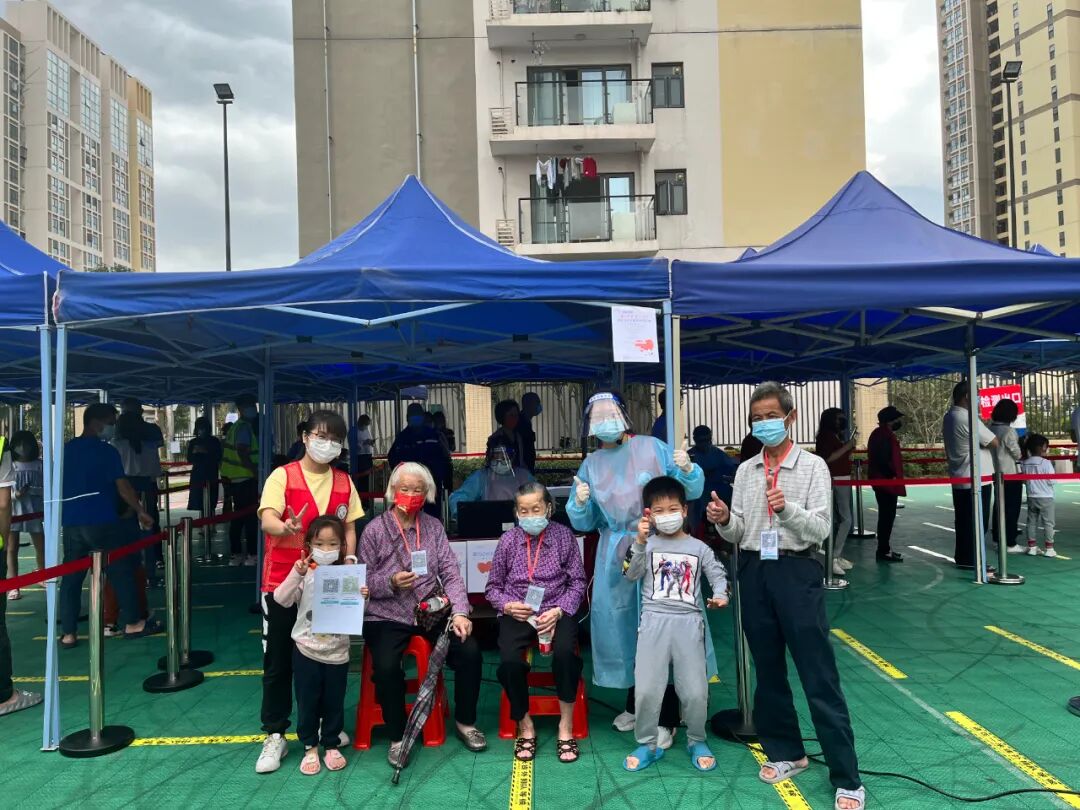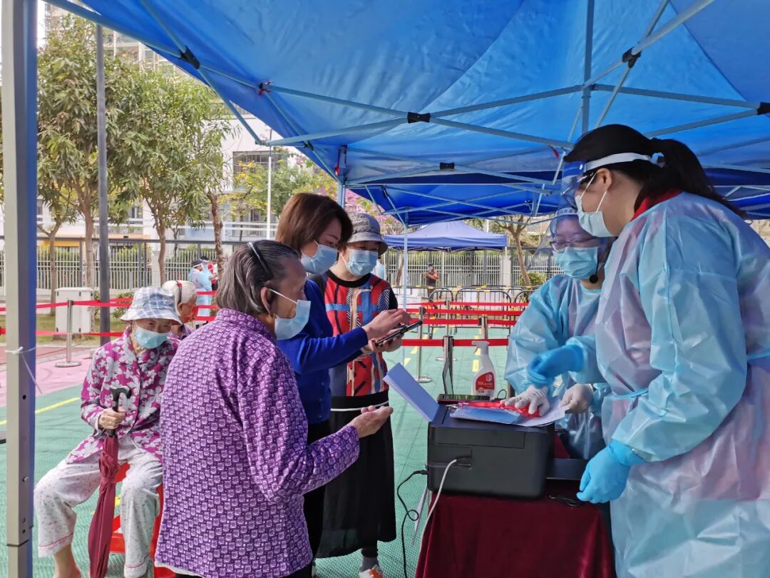 暖民“安心角”,守护居民“心”防线。党群社工在此前协助核酸检测时发现,存在部分居民因核酸码打不开、健康码无法显示、无智能手机等原因,产生急躁不安的情绪,为舒缓居民压力、安抚居民焦虑情绪及提升核酸检测效率,党群工作者在人流量大的竹韵花园篮球场核酸检测点开设了“安心角”,为居民提供核酸码打印、政策咨询、情绪疏导、照看婴儿等便民服务,及时为居民答疑解惑,现场解决居民遇到的困难。居民陈爷爷说到:“有你们真好啊,以前出门做核酸可麻烦了,因为自己不会用智能手机,只能拿着身份证来,工作人员本来就忙,排队的人也多,还要等我的慢慢录进去,真的很不好意思,总感觉给大家添麻烦了,现在有了你们这个安心角帮我打印好了核酸码,一下子就做好核酸了。”