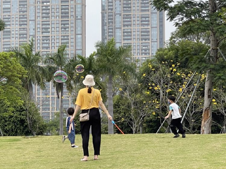 在香蜜公园的空中廊桥、阳光草坪、玫瑰花园、儿童游戏场、海绵绿道、林间书吧……处处都是游人,来这里看树影绰绰、听鸟鸣声声,即使中午天气炎热,但抵挡不住大家对户外踏青的热情。
