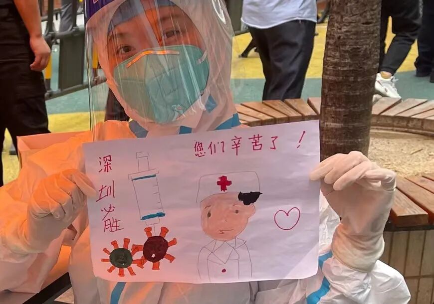 罗检志愿者正疑惑着,低头一看,不由得露出会心一笑:这是小朋友亲手绘制的图画,上面写着:“深圳必胜!您们辛苦了!”