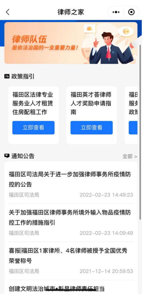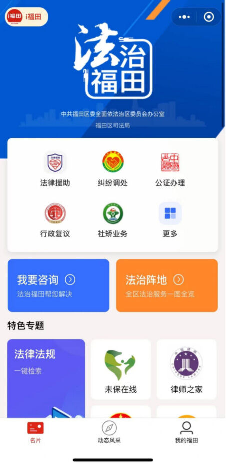 除了传统的司法行政业务,福田司法局还结合辖区实际及居民的迫切需求,推出了不少特色亮点服务。如,“未保在线”充分利用了区未成年人保护服务中心的平台,开设了困境未成年人线索通报、未保云课堂、心理/法律/活动/场地预约、法律评论、法律科普、心理解忧驿站等多样化服务;“为军服务”系专为军人军属提供的方便快捷的线上法律服务;“律师之家”则考虑到了福田区庞大的律师队伍,专门为律师行业提供政策指引、律所招聘公告等服务。