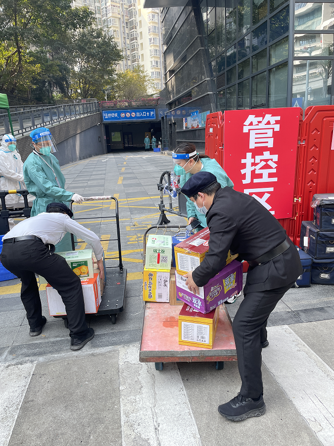 为了方便业主在疫情管控时仍能收到采购的生活物资,冠懋物业想业主所想、急业主所急,及时安排人员在防疫卡口接收物资。物业工作人员们利用板车、超大购物车等各种运输工具从早到晚轮轴转,搬运了数百车次的物资送到指定货架再进行分拣,每人每天平均往返几十趟,大家忙而有序地为住户分送物资。