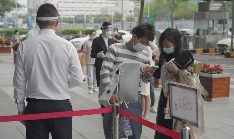 大家有序排队进入办公大厦。
