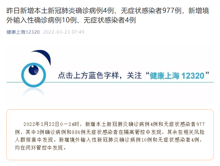 2022年3月22日0—24时,新增本土新冠肺炎确诊病例4例和无症状感染者977例,其中3例确诊病例和886例无症状感染者在隔离管控中发现,其余在相关风险人群排查中发现。新增境外输入性新冠肺炎确诊病例10例和无症状感染者4例,均在闭环管控中发现。