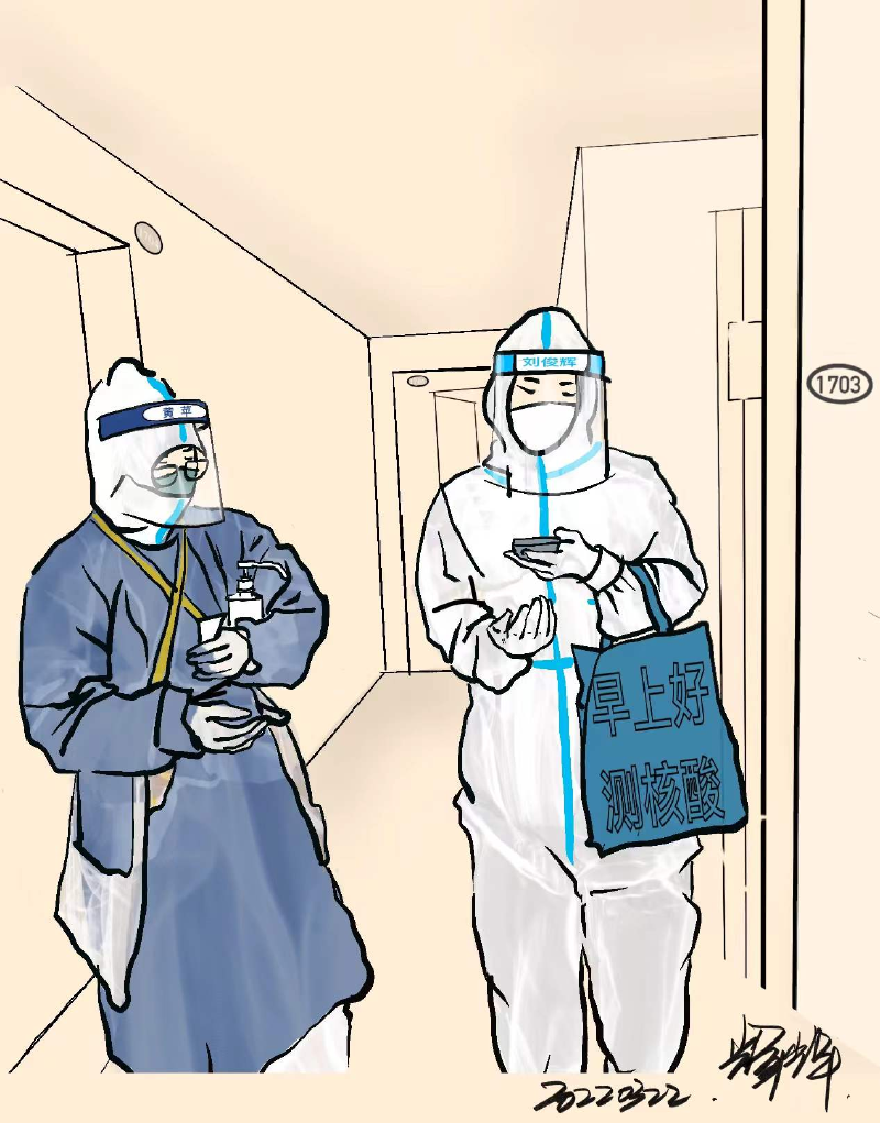 “有一天早上8点,‘大白’叫我们做核酸采样,我推开门拍下了他们采样的画面,并记住了他们的名字。”说到第二幅画的灵感,何芬辉介绍道,医护人员每天早上8点都会准时上门进行核酸采样,每次先说“早上好,上门采核酸啦!”为了让医护人员早点做完核酸采样,每天早上,她都早早起床,在门口等待着那一声“早上好”。