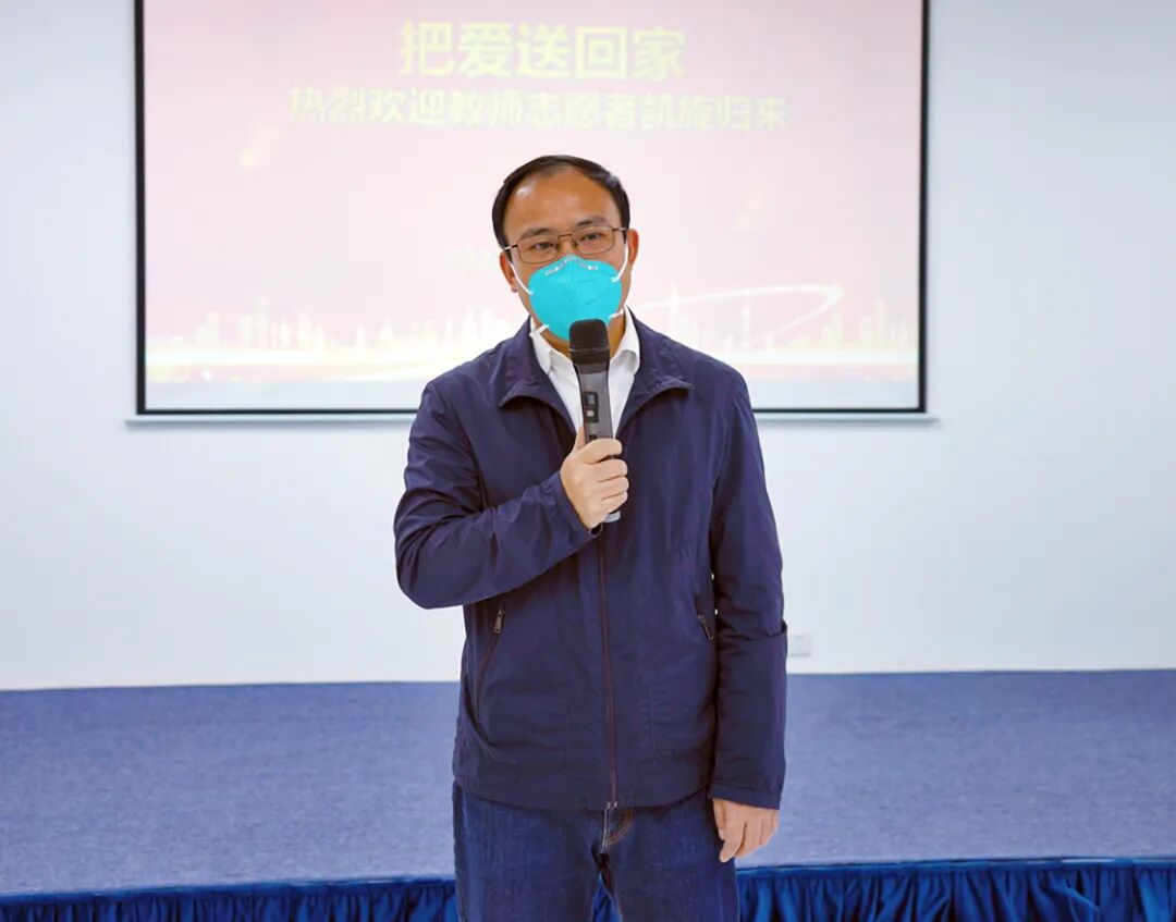 周江涛代表区委区政府对志愿者在上沙社区的辛勤付出表达感谢和敬意,对他们的平安归来表示欣慰,也对仍在上沙社区奋战的教师志愿者表示衷心的感谢。作为3月初同样在上沙奋战7天的“大白”,周江涛对志愿者们所经历的一切深有体会,也目睹了教师志愿者的任劳任怨、勇往直前,对他们的高尚品德和责任担当给予了高度评价,希望老师们把爱和力量带回学校,传递给孩子们,为城市发展、为国家富强培养更多栋梁之材。
