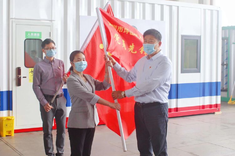 启用仪式上,坪山区人民医院党委书记郭长春代表医院党委向坪山高铁站方舱实验室工作小组授予“党员先锋队”旗,鼓励他们要恪尽职守、履职担当,坚持为人民群众生命健康保驾护航。