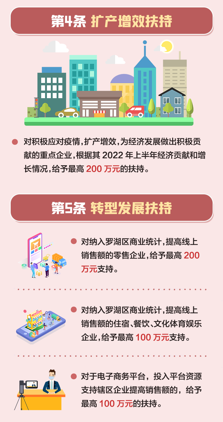 支持零售企业开展网络销售,对纳入罗湖区商业统计,积极开发线上销售平台,优化物流支撑体系,提高其网络销售额的零售企业,按照企业本年度3、4月份线上销售额增量部分,给予最高200万元支持。