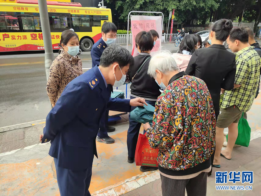 广州市白云区市场监督管理局工作人员派发宣传物料。新华网发