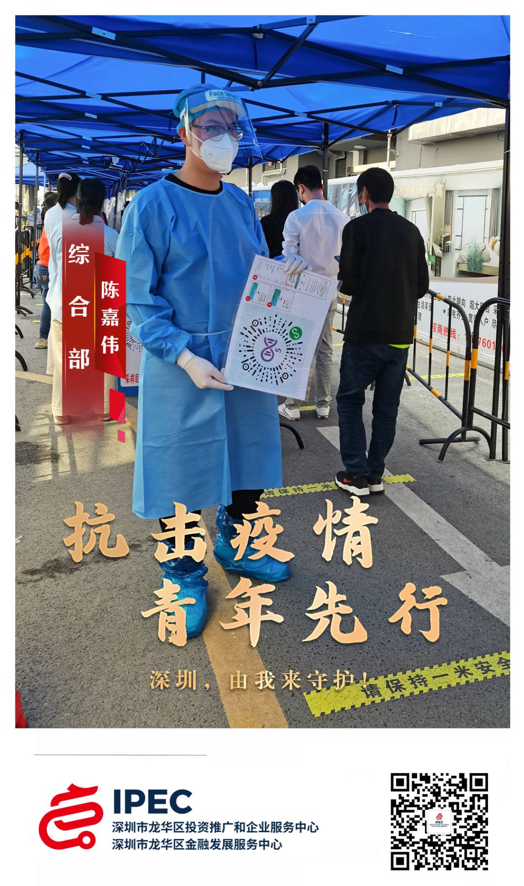 和所有人一样,陈嘉伟在新冠肺炎疫情反复的三年里,慢慢适应防控下的生活。在他此前的世界里,陈嘉伟没想过有一天还会被冠以“逆行者”“社区守护者”这样的身份。因为疫情,陈嘉伟成为这座城市众多志愿者的一名,无数次化身“志愿红”、“防护蓝”。作为龙华区投资推广和企业服务中心(以下简称“中心”)综合部的一员,今年3月3日,他再次以一名疫情防控志愿者的身份,与另外两名同事结伴支援樟溪社区。从初期在核酸检测点协助现场维持秩序,到疫情严峻时上楼访户登记信息、巡查卡口严守社区,他接手防控各项工作,成为深圳“打工”人的守护者。