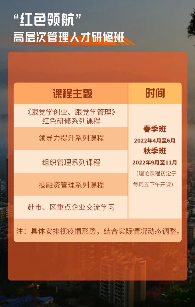 “红色领航”高层次管理人才研修班聚焦人才政治引领和管理能力提升,以“跟党学创业、跟党学管理”为重点,面向辖区重点企业高层次管理人才,针对企业学员所在行业和职务精研内容,定制“小班制、精品化、系统性”的特色课程,进一步提升企业学员的管理能力与企业战略架构构建能力,以“理论工具+案例讨论+模拟演练+实地学习”的模式,力邀名师开坛授课,在红色文化浸润和专业知识学习中激发人才职业发展内生动力。