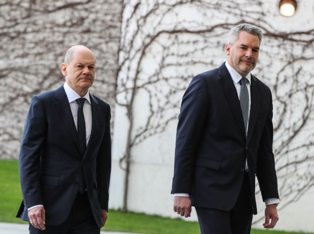 3月31日,德国总理朔尔茨(左)在总理府会见来访的奥地利总理内哈默。新华社记者单宇琦摄
