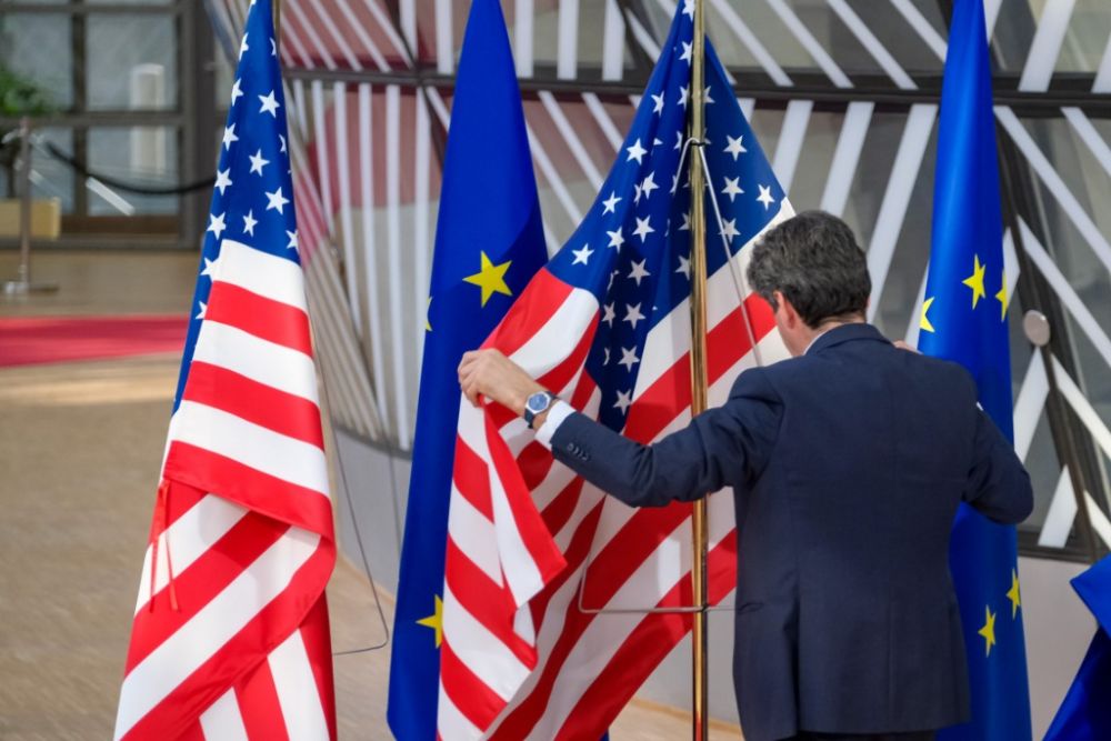 3月24日,工作人员在比利时布鲁塞尔的欧盟总部整理美国国旗。新华社记者张铖摄