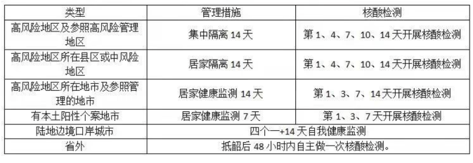 倡导韶关市外低风险地市(无本土阳性个案)来(返)韶的,返韶48小时内完成一次核酸检测,加强自我健康监测。从有本土阳性个案所在地市(非中高风险地区)来(返)韶的,返韶后实行7天居家健康监测,第1、3、7天开展核酸检测;其他管理措施详见下表: