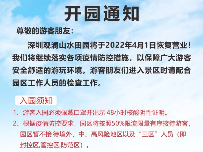 观澜山水田园4月1日起恢复营业。游客入园须出示48小时核酸阴性证明。