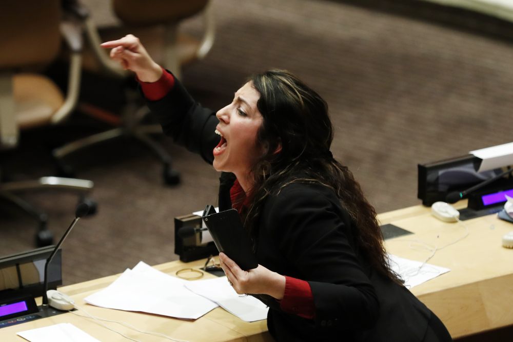 2018年10月16日,一名古巴代表在位于纽约的联合国总部举行的会议上呼喊口号。当日,美国发起的指责古巴违反人权的一场会议在联合国总部遭到数国外交官强烈抗议。新华社记者李木子摄