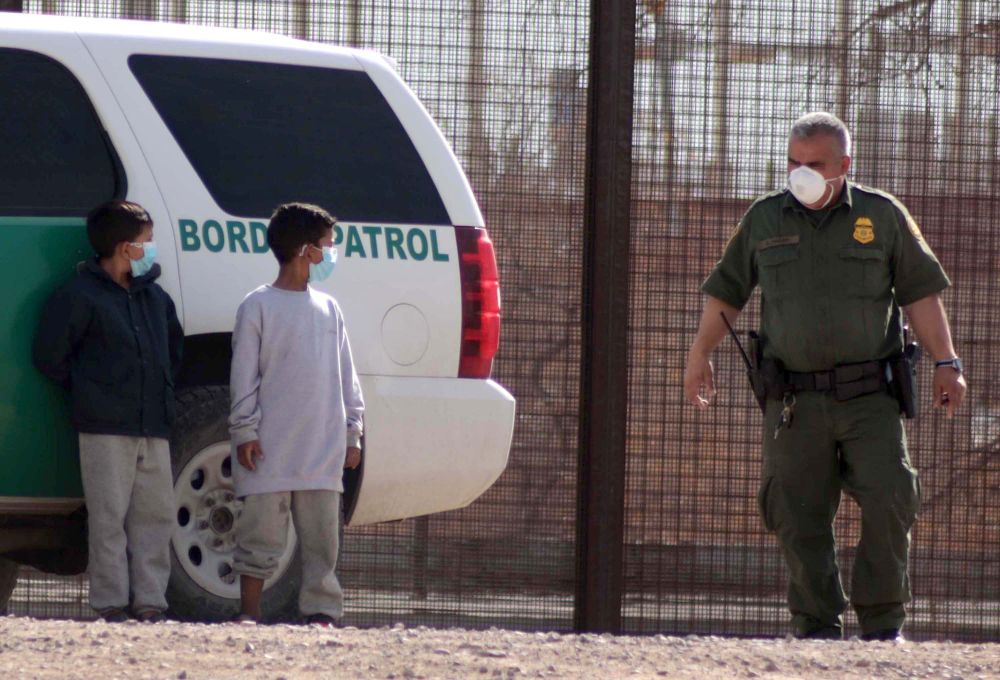 这张2021年3月27日在墨西哥华雷斯拍摄的照片显示,两名来自危地马拉的移民儿童在跨越美墨边境的里奥格兰德河后,等待接受美国边境巡逻队人员的处理。 新华社发(戴维·佩纳多 摄)