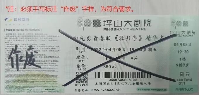 已取票的观众,请将您的退票按下图用黑色笔标注“作废”字样,并用黑色笔写上您的姓名和电话。添加【坪大方】微信(微信号:pdf89336660),拍摄清晰照片发送至坪大方,信息核对无误后,将逐一安排退款。