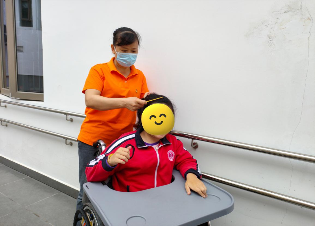 区社会福利中心何春芳护理长,为院内残疾儿童梳妆整理
