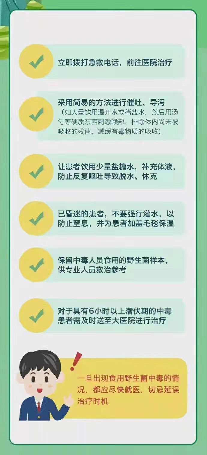 因此,预防野生蘑菇中毒要做到以下三点:1.不采摘。踏春郊游期间,广大群众不要因为好奇或为满足口腹之欲采摘野生蘑菇或来源不明的蘑菇等,由于鉴别毒蘑菇并不容易,广大群众不要轻易采摘。2.不购买。勿在路边摊贩购买蘑菇,即使在正规市场上购买野生蘑菇,也不能放松警惕,尤其是没吃过或不认识的野生蘑菇,不要偏听偏信,轻易买来食用。3.不食用。为避免食物中毒,家庭要慎食野生蘑菇。集体聚餐、餐饮服务、民俗旅游等不要加工食用野生蘑菇,以确保饮食消费安全。