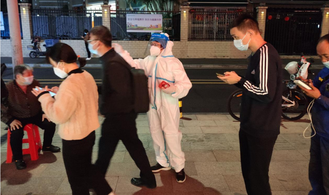明月社区党委委员陈奕诗在核酸采样现场,指引居民有序排队
