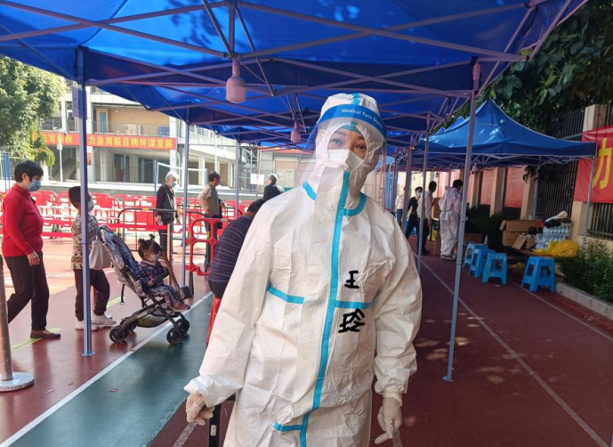 志愿者王玲在核酸采样现场协助