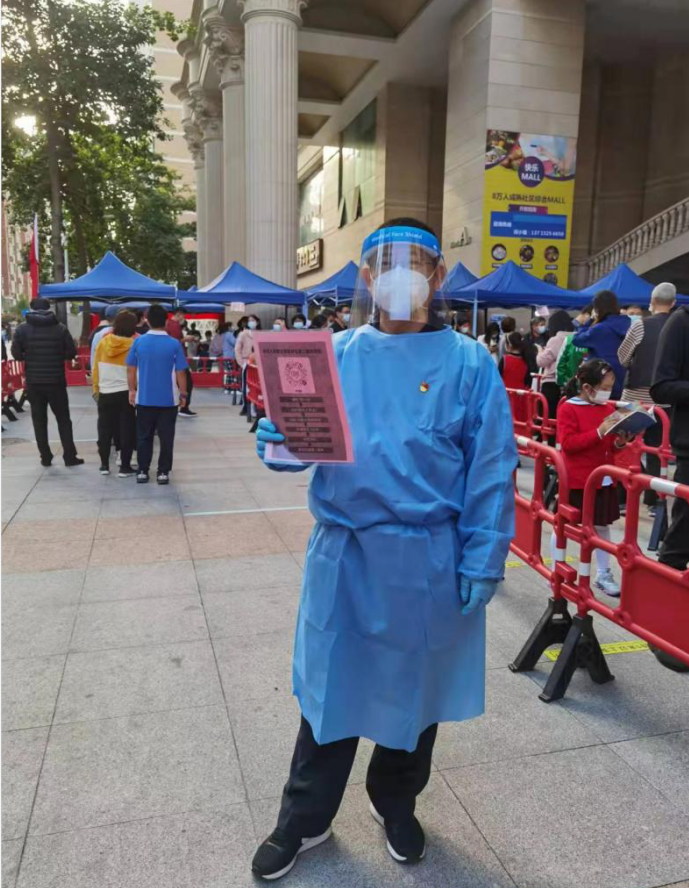 信托花园小区党支部书记贾铻在小区核酸采样现场协助