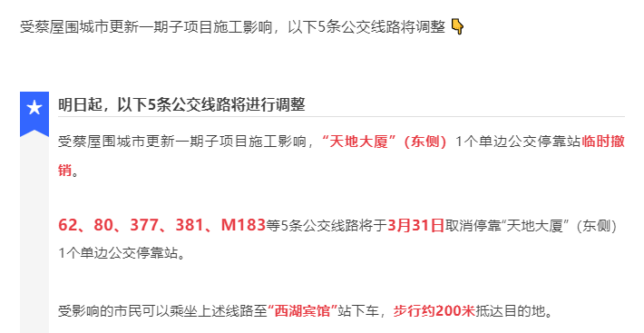 受蔡屋围城市更新一期子项目施工影响,3月31日起,罗湖“天地大厦”(东侧)1个单边公交停靠站临时撤销。62、80、377、381、M183等5条公交线路取消停靠“天地大厦”(东侧)1个单边公交停靠站。