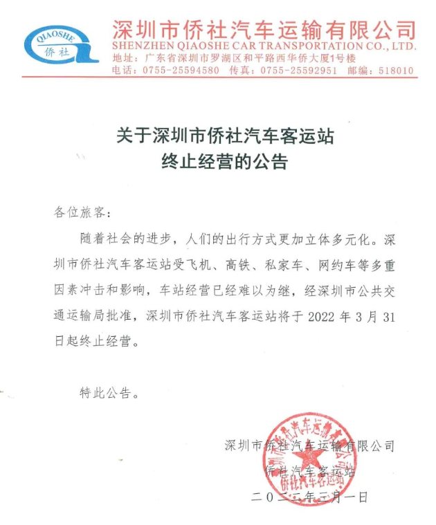 3月31日,深圳市侨社汽车客运站终止经营。据悉,侨社汽车客运站毗邻罗湖口岸,是深圳市最早的长途汽车客运服务点之一,经营的班线主要包括汕头、潮州、潮阳、福州、泉州等地。这里留下了很多深圳人的回忆,也是深圳交通事业发展的见证者。