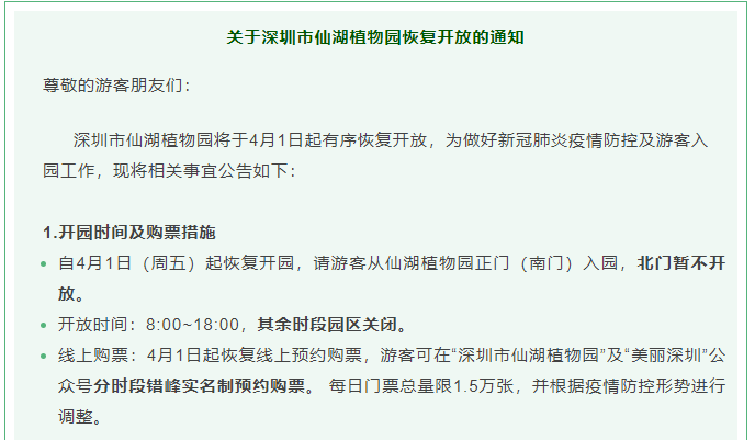 4月1日起,深圳市仙湖植物园恢复线上预约购票,游客可在“深圳市仙湖植物园”及“美丽深圳”公众号实名制预约购票。园区开放时间为8:00~18:00,其余时段园区关闭。