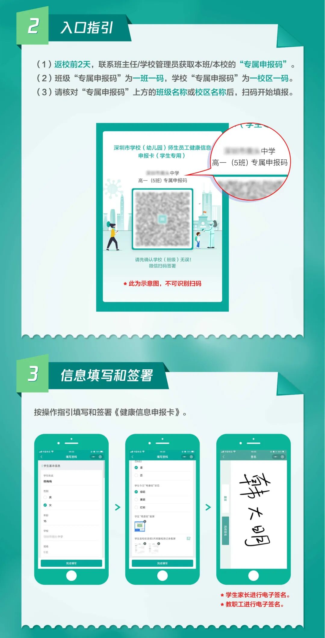 师生员工只需在返校前2天联系学校(班主任)获取本校(本班级)“专属申报码”(学生一班一码,教职员工一校区一码),根据下方操作指引线上完成健康申报。