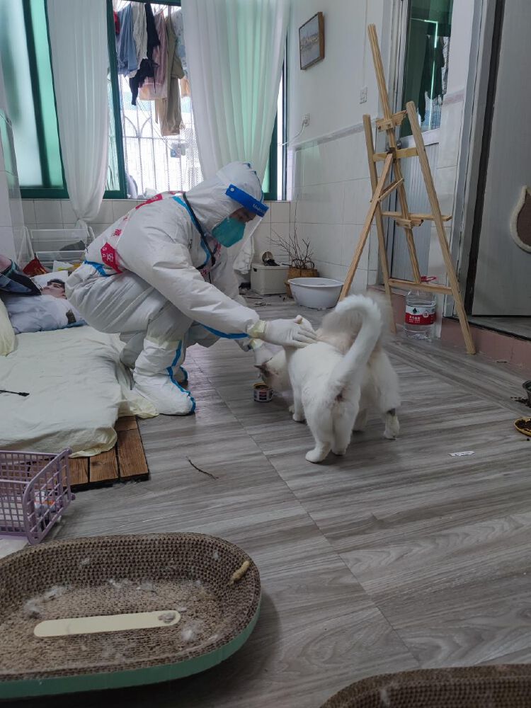 福田城管工作人员杨永志帮隔离的居民照顾宠物。