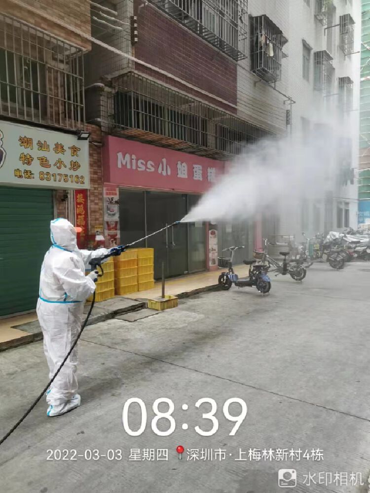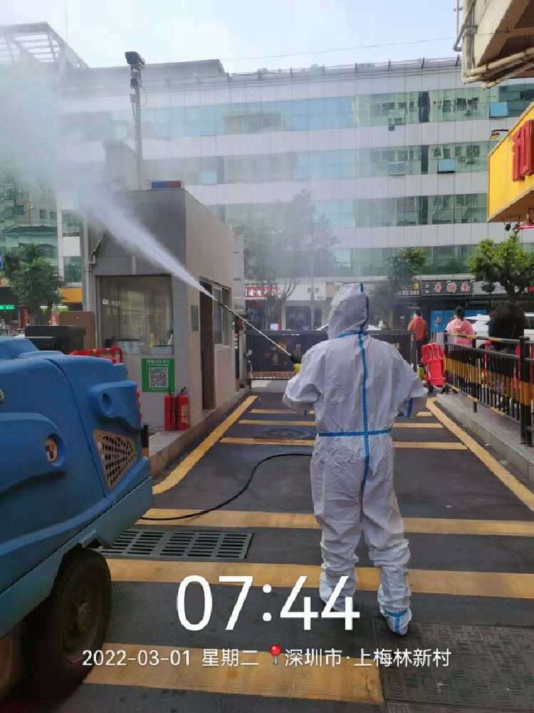 环卫消杀人员对封控管理区开展重点公共区域消杀作业。