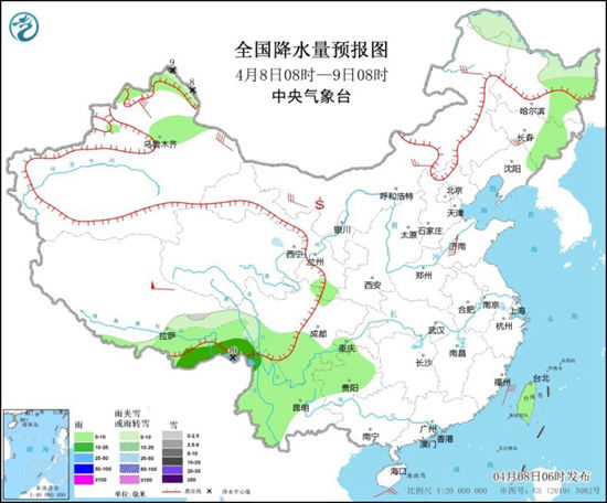 其中今天,降水区域主要集中在西南地区和东北地区等地,预计新疆北疆北部、西藏东北部、内蒙古东北部、黑龙江北部等地部分地区有小雪或雨夹雪,其中,北疆北部山区局地有大雪(5~9毫米)。东北地区东部、新疆北疆北部和沿天山地区、西藏东南部、四川南部、重庆西部、云南西部和北中部、贵州中西部、台湾岛等地部分地区有小到中雨,西藏东南部、云南西北部等地局地有大雨(25~40毫米)。