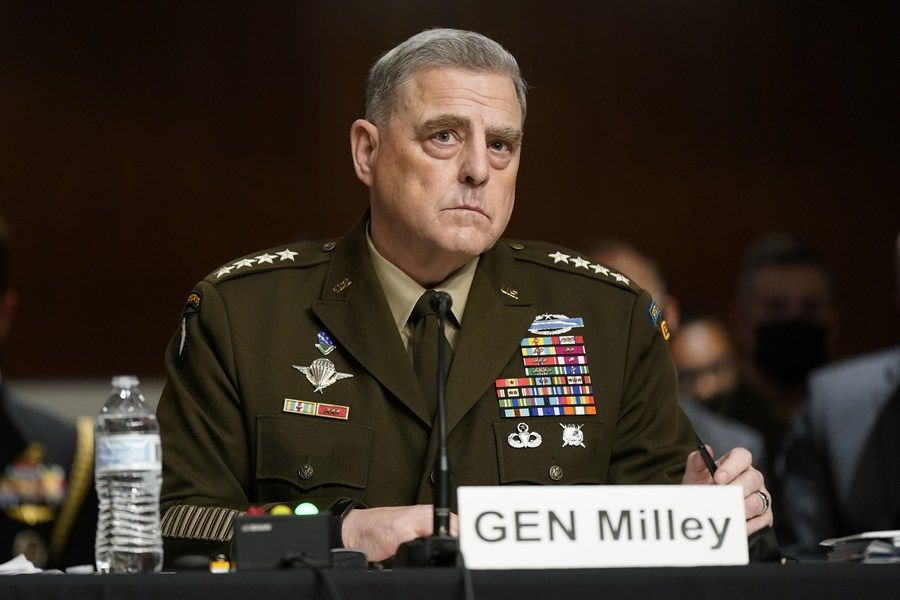 2021年9月28日,美军参谋长联席会议主席马克·米利在美国华盛顿出席国会听证会。(新华社发,Pool图片/帕特里克·塞曼斯基摄)