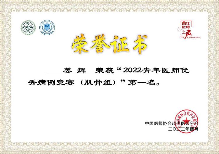 近日,在“中国医师协会超声医师分会青年优秀病例系列竞赛”中,来自龙岗中心医院超声科(肌骨组)姜辉医生比赛表现优越,荣获2022青年医师优秀病例竞赛(肌骨组)第一名。