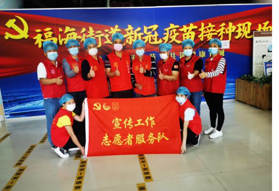 ▲福海街道新冠疫苗接种现场志愿者合影。