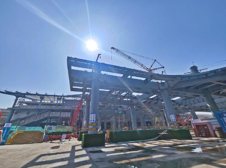 大运综合交通枢纽沿龙岗大道西侧呈南北向布置,为既有3号线、在建的14、16号线、规划33号线的换乘站。上午9时,记者在建设现场看到,工人正在紧张施工,吊塔正伸展巨臂,奋力搬运,随处可见身穿工作服,头戴安全帽忙碌的人群,一派热火朝天的景象。目前枢纽顶部巨大的流线形钢雨棚已清晰可见,这被称为“湾区之舞”,设计十分轻盈新颖。