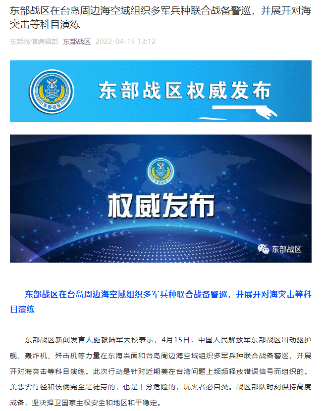 东部战区新闻发言人施毅陆军大校表示,4月15日,中国人民解放军东部战区出动驱护舰、轰炸机、歼击机等力量在东海当面和台岛周边海空域组织多军兵种联合战备警巡,并展开对海突击等科目演练。此次行动是针对近期美在台湾问题上频频释放错误信号而组织的。美恶劣行径和伎俩完全是徒劳的,也是十分危险的,玩火者必自焚。战区部队时刻保持高度戒备,坚决捍卫国家主权安全和地区和平稳定。