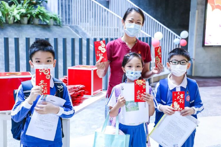 除了各班组的老师,还有校长臧秀霞也在校门口迎接孩子们。看,这亮闪闪的红包,给足了孩子满满的仪式感。
