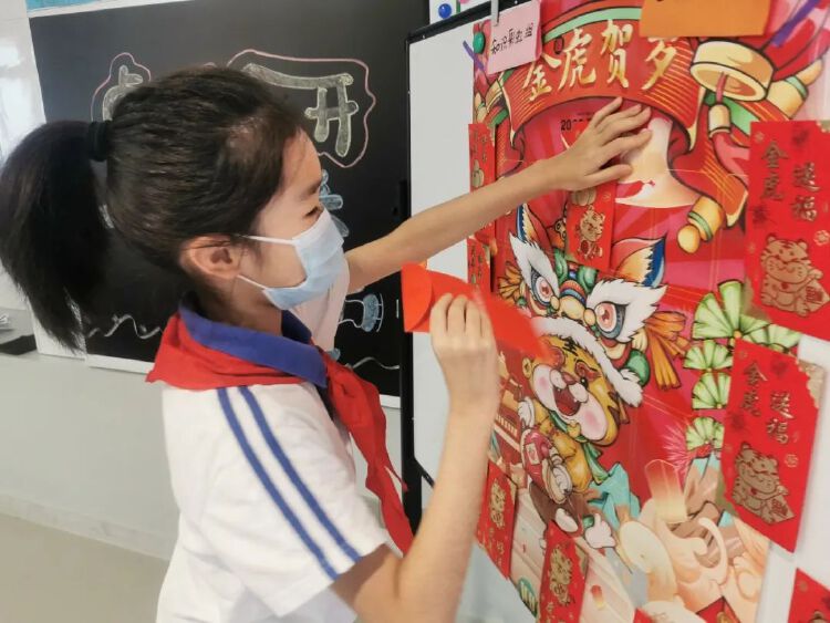 三年级的老师用虎年红包在黑板上拼出各种形状的图案,孩子们一进教室就被红包墙吸引,在讲完返校后要注意的防疫措施及心理调节方式之后,就进入期待已久、激动人心的抽红包环节啦!