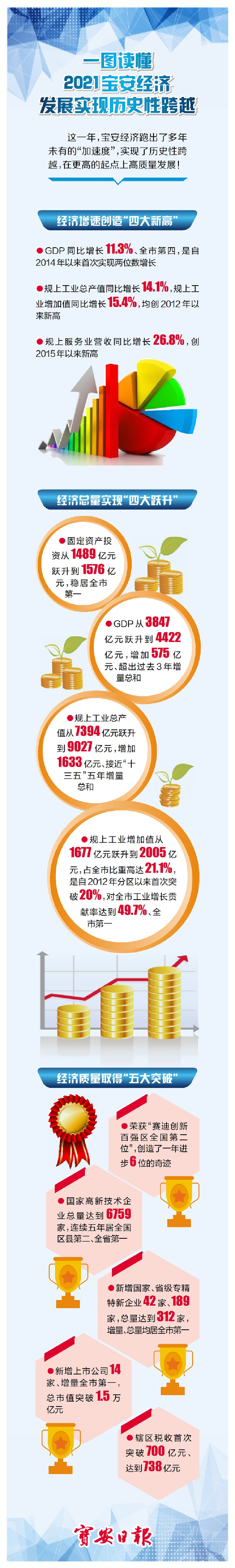 数据显示,过去一年,宝安区经济发展跑出了多年未有的“加速度”,实现了历史性跨越,在更高的起点上高质量发展。在经济增速方面创造了“四大新高”。GDP同比增长11.3%、深圳第四,自2014年以来首次实现两位数增长;规上工业总产值同比增长14.1%,规上工业增加值同比增长15.4%,均创2012年以来新高;规上服务业营收同比增长26.8%,创2015年以来新高。