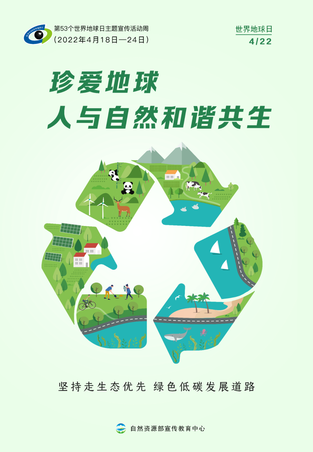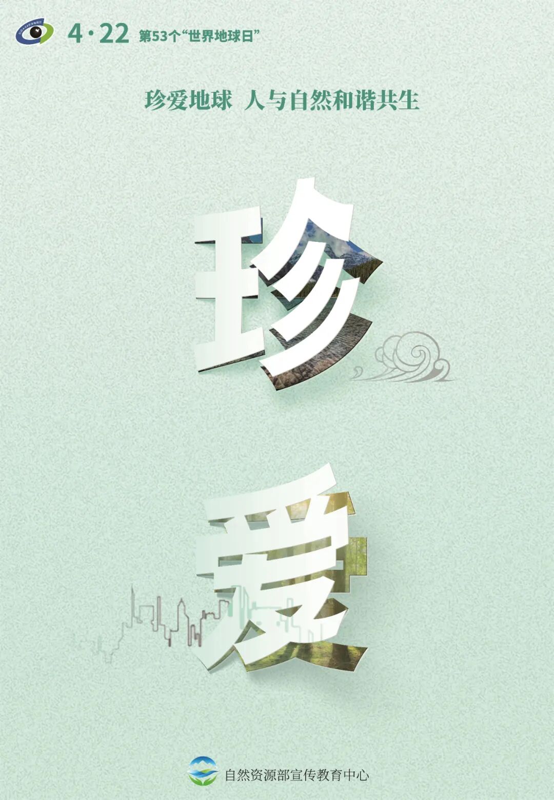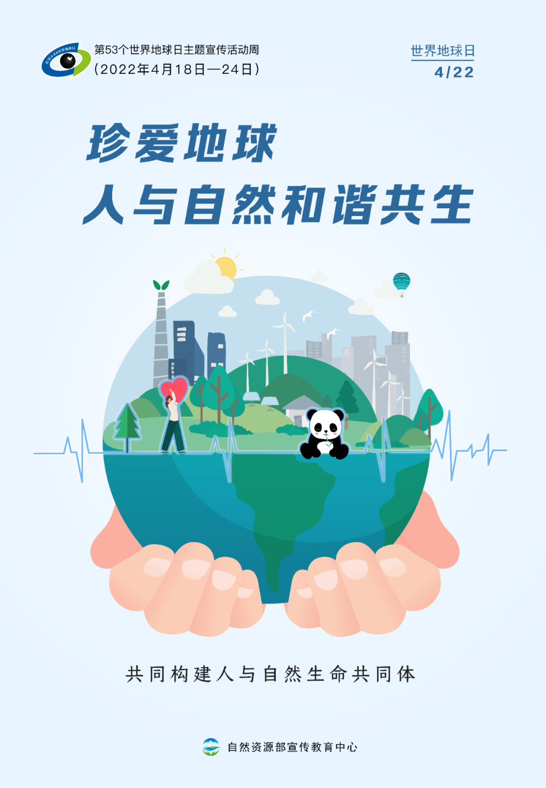 2022年4月22日是第53个世界地球日,今年的宣传主题是“珍爱地球 人与自然和谐共生”。世界地球日主题宣传活动周之际,自然资源部宣传教育中心策划制作了宣传海报,倡议全社会尊重自然、顺应自然、保护自然,积极践行习近平生态文明思想。