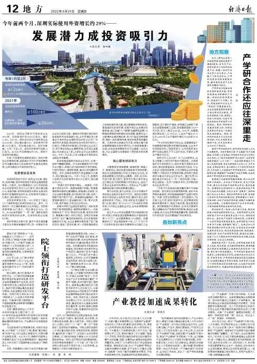 4月21日,《经济日报》刊登题为《今年前两个月,深圳实际使用外资增长约29%——发展潜力成投资吸引力》的文章。全文如下: