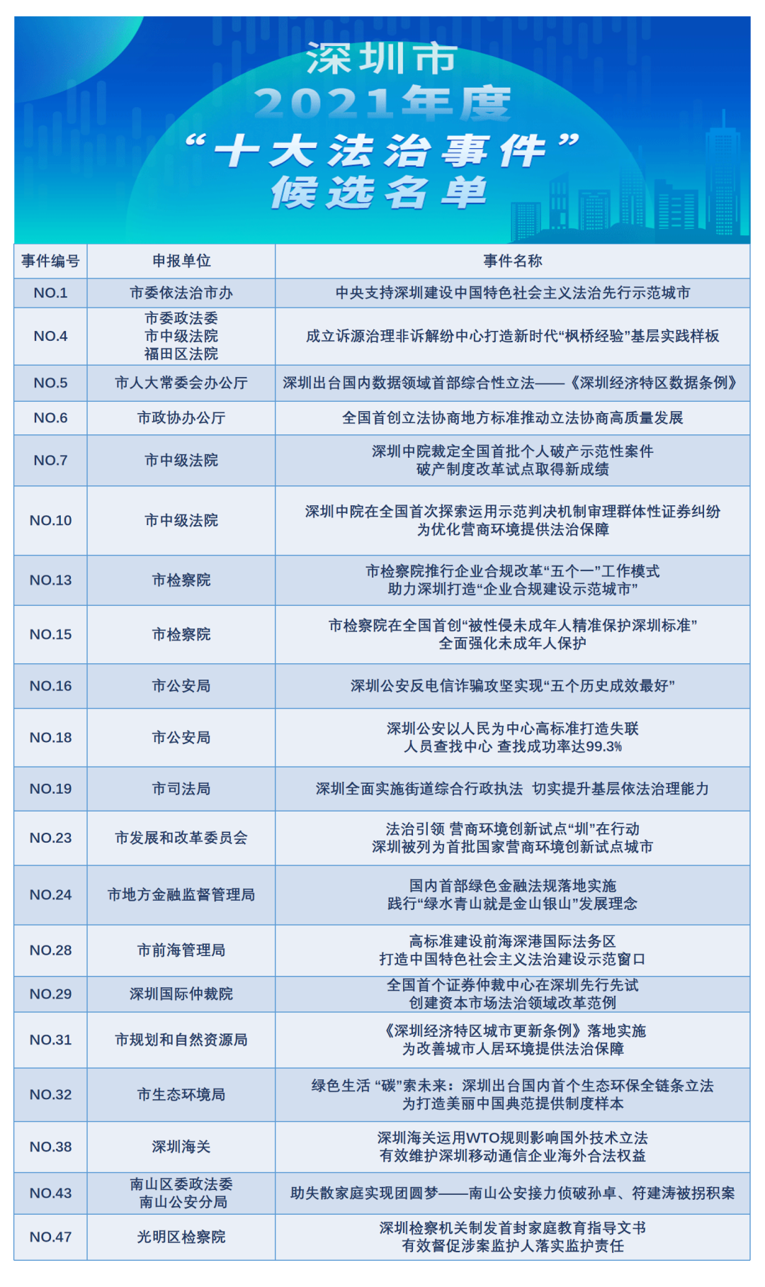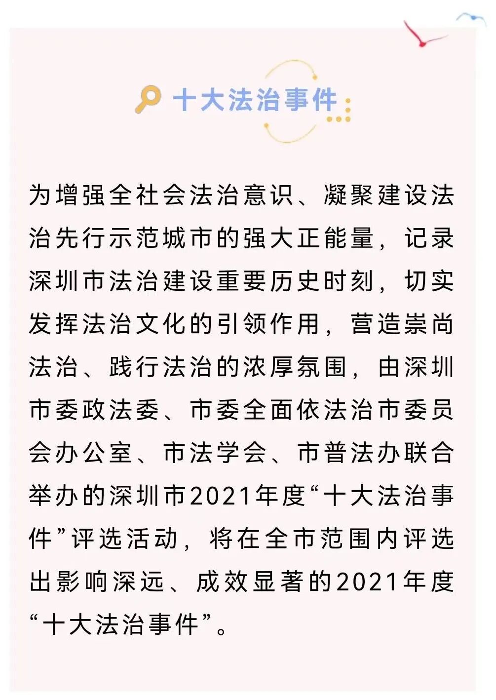 重要消息!由深圳市委政法委、市委全面依法治市委员会办公室、市法学会、市普法办联合主办的深圳市2021年度“双十”评选活动即将启动!
